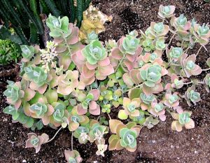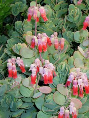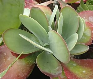 Kalanchoe Marnieriana– Flat blue-green rounded leaves with rose pink/red flowers